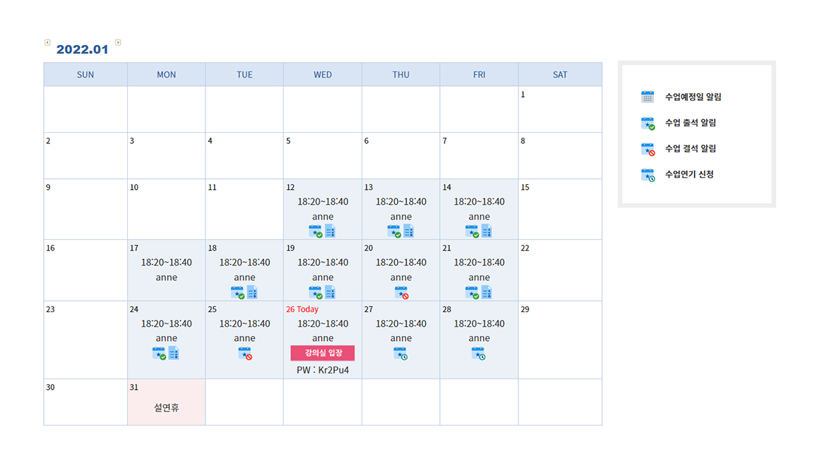 수업일, 출/결석 여부, 일일평가서를 확인할 수 있으며 또한 수업하루 전까지 수업 홀드를 신청할 수 있습니다.