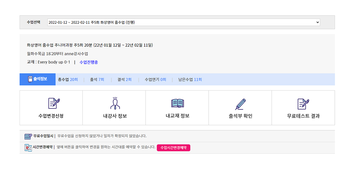 내강의실 수업요약 표시란에서 수업명, 수강기간, 무료테스트 결과, 내강사 정보, 내교재 정보등 현재 수강중인 수업에 대한 기본 정보를 확인할 수 있습니다.